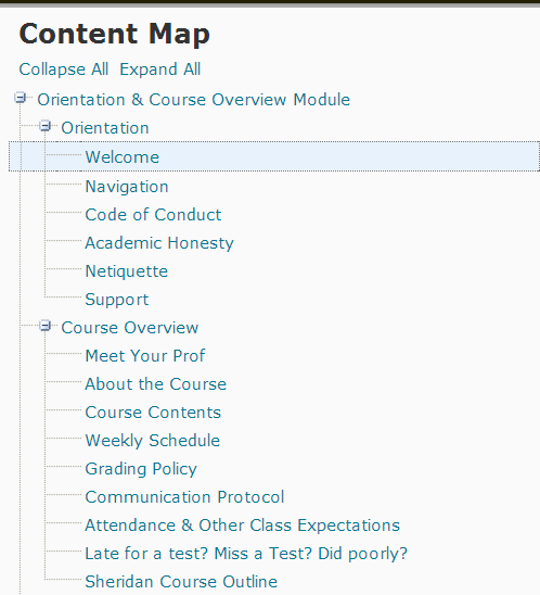 This semester, I took a different approach. I trashed my syllabus and, like a good Chinese meal, broke it down into bite-sized webpages on my course website. In this age of Twitter and texting, who has the attention span to read a 10+ page syllabus? This is what the outline of my “Orientation & Course Overview Module” looks like on my course website: